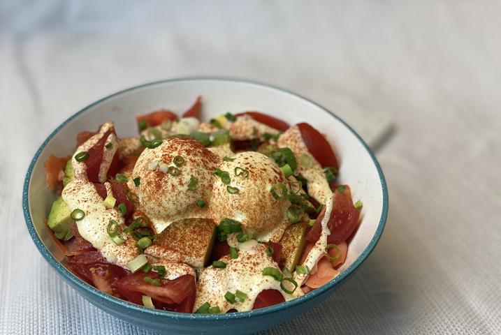 Smoked salmon, avocado, cherry tomatoes, & green onions